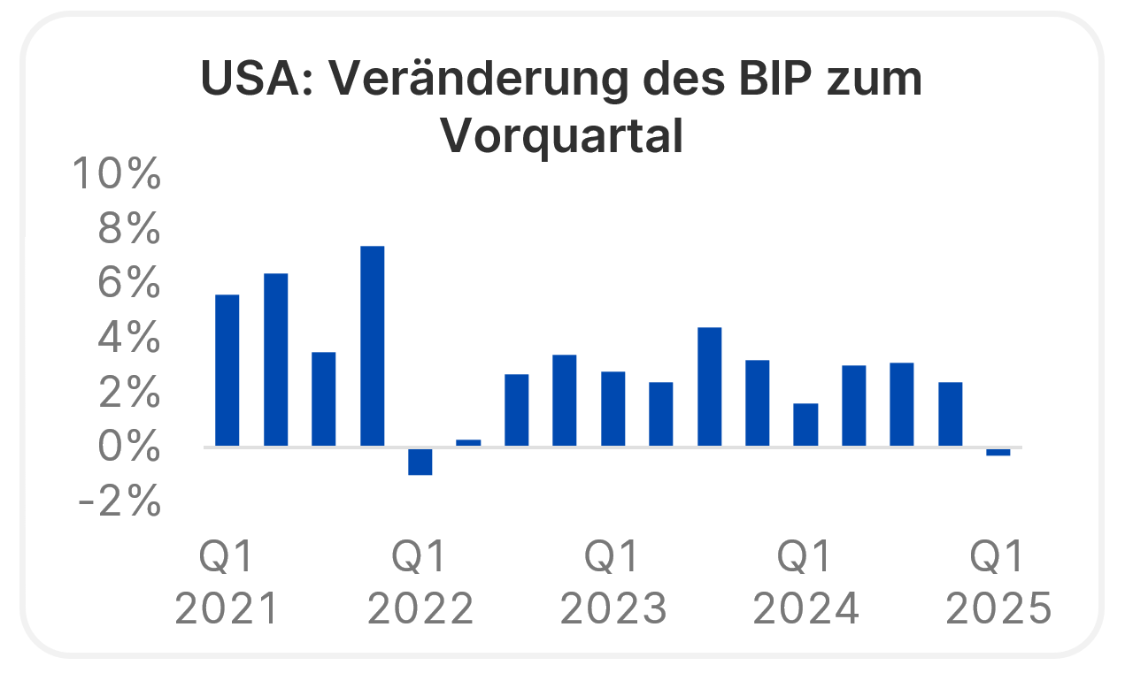 Das negative erste Quartal ist primär jedoch auf einen Sondereffekt zurückzuführen. In Erwartung höherer Zölle hatten US-Unternehmen zuletzt die Einfuhren stark erhöht. Volkswirtschaftliche Hard-Facts wie der Arbeitsmarkt oder Inlandskonsum zeugen jedoch weiterhin von einer sehr robusten US-Wirtschaft. Die kommenden Monate werden zeigen, wie negativ sich die aktuell erhöhte Verunsicherung tatsächlich auswirkt.