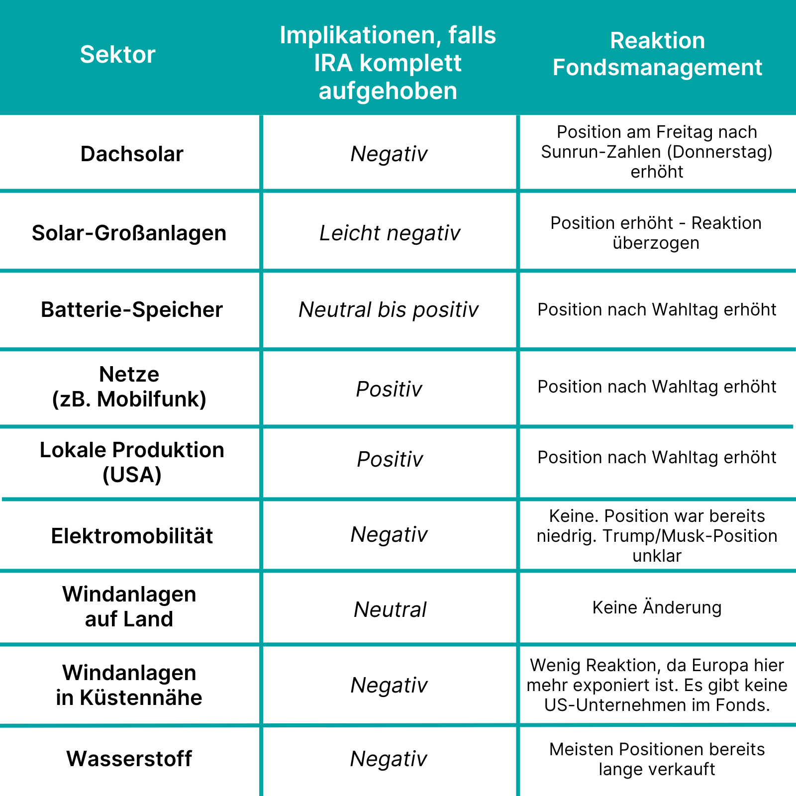 Wie erwähnt, hatten wir vor der Wahl erhöhte Cash-Quoten, die angesichts der extremen Reaktion allerdings nur wenig geholfen haben. Dieses Cash werden wir nun verwenden, um punktuell Titel zuzukaufen, die entweder am wenigsten von einem worst case (IRA-Aufhebung) betroffen sind bzw. wo dies schon am dramatischsten eingepreist (überpreist) ist. Untenstehend eine Übersicht der verschiedenen Themen, und wie wir im Zuge der Wahl reagiert haben.