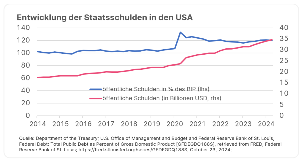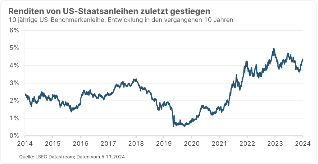 Ein Anstieg der Inflation wäre nachteilig für Anleihen. Zudem würde durch die Aussicht auf einen schnelleren Anstieg der Staatsschuldenquote das Risiko zunehmen, dass am Markt eine höhere Prämie für das Halten von Staatsanleihen verlangt wird. Die Rendite der zehnjährigen Staatsanleihen ist seit Mitte September bereits deutlich angestiegen. Neben kräftigen Wachstumsdaten kann das auch auf die zugenommene Wahrscheinlichkeit für einen Wahlsieg von Trump zurückgeführt werden.
