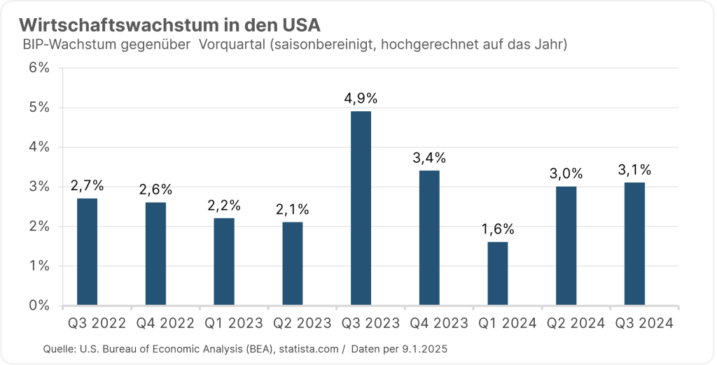 Das US-Bruttoinlandsprodukt legte im dritten Quartal aufs Jahr hochgerechnet um 3,1 Prozent zu, wie das US-Handelsministerium im Dezember mitteilte. Getragen wurde die Konjunktur in den Sommermonaten von den privaten Konsumausgaben, die sich mit 3,7 Prozent etwas stärker erhöhten als zunächst ermittelt. Der Internationale Währungsfonds (IWF) hat seine Wachstumsprognose für die USA kürzlich ebenfalls angehoben und rechnet für das zu Ende gegangene Jahr mit einem Plus von 2,8 Prozent.