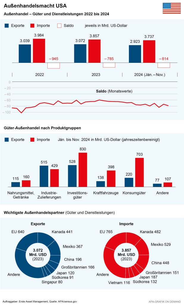Damit startet die US-Konjunktur mit positiven Vorzeichen ins neue Jahr. Herausforderungen könnte Trumps beginnende Amtszeit aber nicht nur für die Handelsbeziehungen, sondern auch für einzelne Branchen bringen. So dürfte der Pharmasektor nicht nur unter Zöllen auf importierte Komponenten leiden. Trump will hohen Medikamentenpreisen den Kampf ansagen, zudem will er den bekennenden Impfgegner Robert F. Kennedy Jr. zum Gesundheitsminister machen.