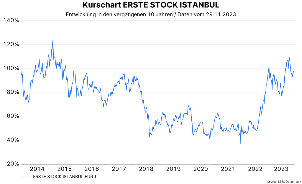 Der ERSTE STOCK ISTANBUL investiert vor allem in Unternehmen mit Sitz oder Börsennotiz in der Türkei. Im Moment ist er etwas defensiver ausgerichtet mit Schwerpunkten auf den Industriesektor und Basiskonsum. Fondsmanager Alexandre Dimitrov hat dabei starke Bilanzen, Profitabilität und gut geführte Unternehmen im Auge, die sich in guten, wie in schlechten Zeiten entwickeln und wachsen können. Zurückhaltend ist er derzeit im Finanzwesen und bei Immobilienwerten, die durch das hohe Zinsniveau belastet sind.