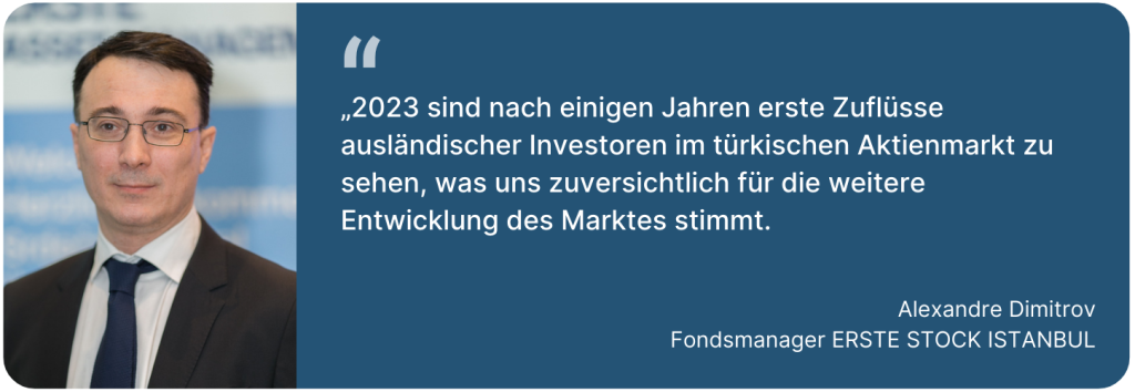 Die Unternehmen scheinen die Inflation gut bewältigen zu können und die Preiserhöhungen an die Kunden weitergeben können. Die Unternehmen weisen höhere Gewinne aus, die Gewinnmargen sind gestiegen. „2023 sind nach einigen Jahren erste Zuflüsse ausländischer Investoren im türkischen Aktienmarkt zu sehen, was uns zuversichtlich für die weitere Entwicklung des Marktes stimmt“, betont Fondsmanager Dimitrov.
