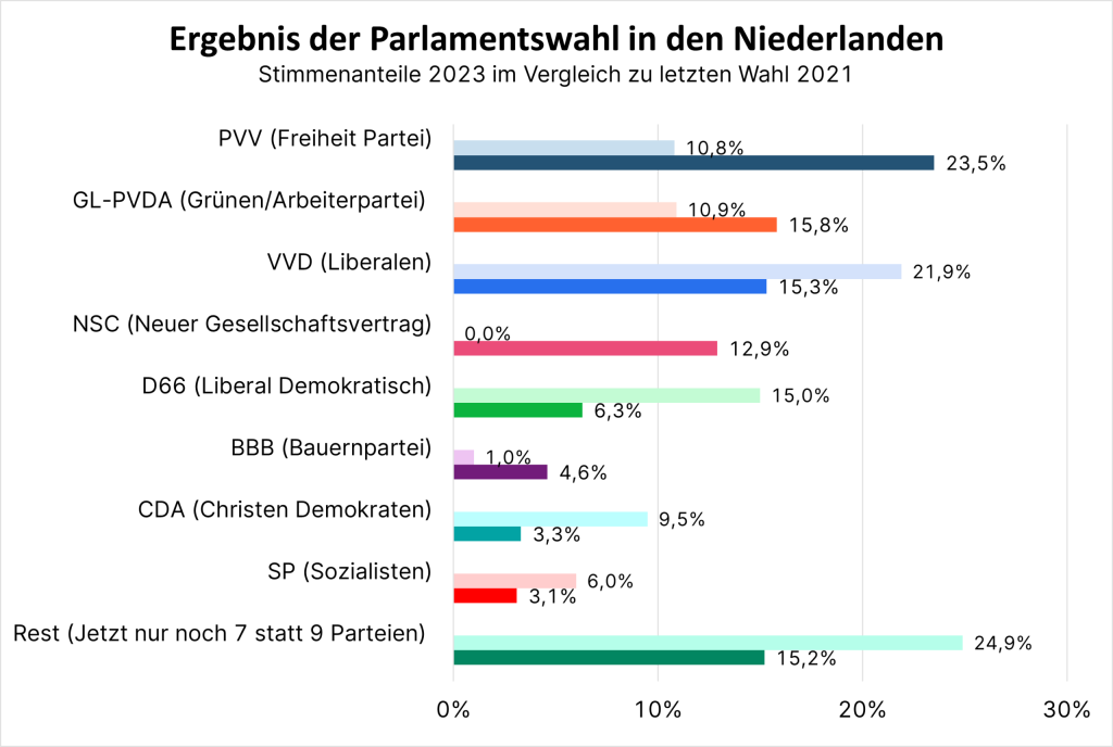 Der dann noch stärker als erwartete Stimmenanteil für die PVV, die mit mehr als 23% Prozent (37 von insgesamt 150 Sitzen) die eindeutig größte Fraktion im Parlament ist, löste in den Niederlanden eine Schockwelle aus. Der Wandel hin zu populistischen Parteien verdeutlicht die Unzufriedenheit der Niederländer:innen mit traditionellen Politiker:innen und der politischen Verantwortung der Regierung.
