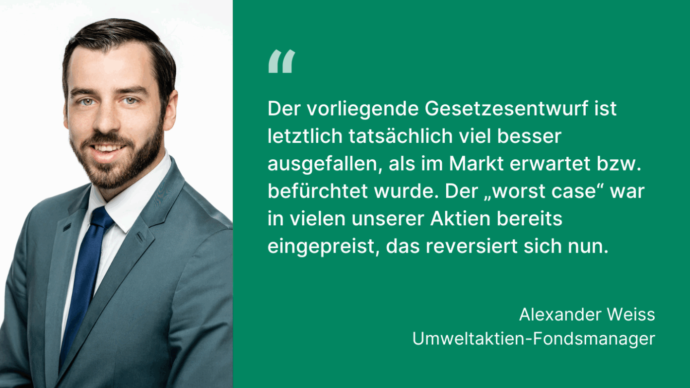 Der vorliegende Gesetzesentwurf ist letztlich tatsächlich viel besser ausgefallen, als im Markt erwartet bzw. befürchtet wurde. Der „worst case“ war in vielen unserer Aktien bereits eingepreist, das reversiert sich nun. Einige der Aktien im ERSTE WWF STOCK ENVIRONMENT und im ERSTE GREEN INVEST konnten sich innerhalb eines Monats verdoppeln. Man muss aber darauf hinweisen, dass der aktuelle Vorschlag nur der Ausgangspunkt ist, von dem aus wegverhandelt wird. Die Erwartung des Marktes war, dass der erste Gesetzesentwurf maximal negativ sein wird und von dort weg zu etwas Realistischerem verhandelt wird. Dass wir bereits mit so einem konstruktiven Vorschlag starten, ist sehr positiv für nahezu alle Unternehmen im Cleantech-Universum.