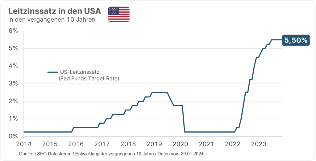 Aktuell liegt das obere Ende der Bandbreite für den Leitzinssatz bei 5,5%. Die in den vergangenen Monaten zurückgegangene Inflation hat auch das vorherrschende Marktthema geändert. Während zuvor noch darüber diskutiert wurde, auf welches Niveau die Leitzinsen angehoben werden sollen, steht jetzt im Fokus, wann die Zinsen wieder gesenkt werden.