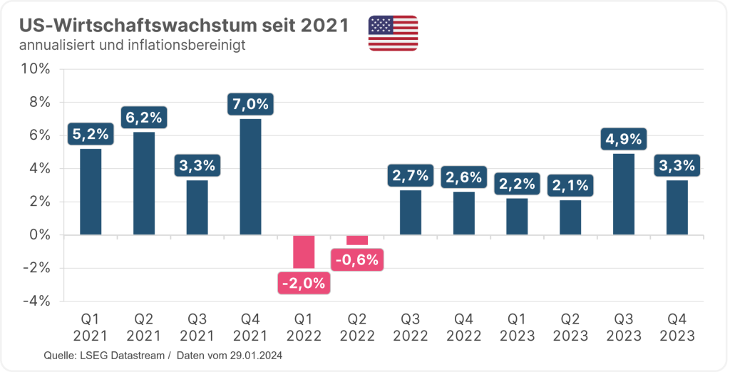 Die US-Wirtschaftsdaten aus den vergangenen beiden Quartalen sprechen jedoch mehr für das Szenario „keine Landung“, also eine fallende Inflation, während das Wirtschaftswachstum trotz der Leitzinsanhebungen weiterhin robust bleibt. Zu Jahresende 2023 ist die Wirtschaft in den USA inflationsbereinigt überraschend deutlich um 0,8% gewachsen, auf das Jahr hochgerechnet wäre das ein Wert von 3,3%. Schon im dritten Quartal lag das bereinigte und auf das Jahr hochgerechnete Wachstum des Bruttoinlandsprodukts (BIP) bei starken 4,9%. Gleichzeitig lag die Kerninflation, auf Basis des jeweiligen Vorquartals und auf das Jahr hochgerechnet, bereits das zweite Quartal in Folge bei 2%.