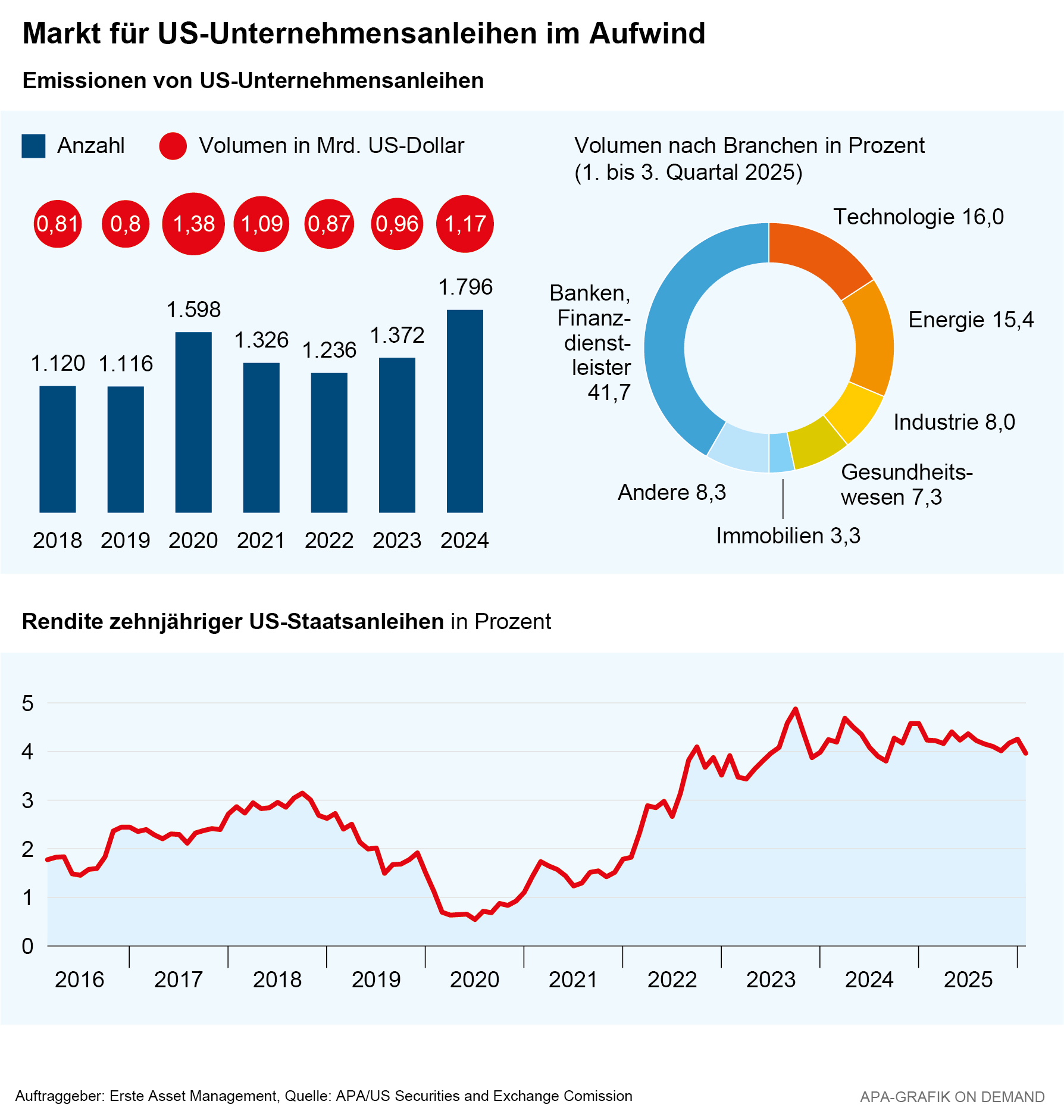 Für Anleger:innen, die an der Entwicklung des US‑Unternehmensanleihenmarkts partizipieren möchten, bieten Fonds eine einfache Möglichkeit zur breiten Streuung. In qualitativ hochwertige US‑Corporate‑Bonds mit Investment‑Grade‑Rating investiert etwa der ERSTE BOND USA CORPORATE, der ein diversifiziertes Portfolio aus Unternehmensanleihen führender US‑Emittenten bietet.