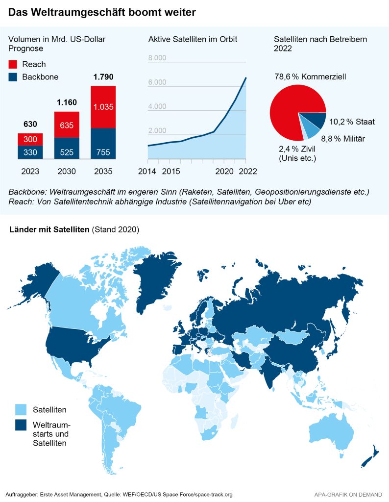 Laut einem 2024 publizierten Branchenbericht des Weltwirtschaftsforums dürfte das Volumen des Weltraumgeschäfts von 330 Mrd. Dollar im Jahr 2023 auf 525 Mrd. im Jahr 2030 und auf 755 Mrd. im Jahr 2035 wachsen. Das entspräche einer jährlichen Wachstumsrate von rund 7 Prozent. Diese Zahlen umfassen nur das Weltraumgeschäft im engeren Sinn, etwa Raketenbauer und Satellitenbetreiber. Zählt man dazu noch jene Branchen, die nur durch Weltraumtechnologien wie etwa GPRS-Dienste überhaupt möglich sind, sieht die Studie sogar ein Wachstum von 630 Mrd. im Jahr 2023 auf 1,8 Billionen im Jahr 2035.