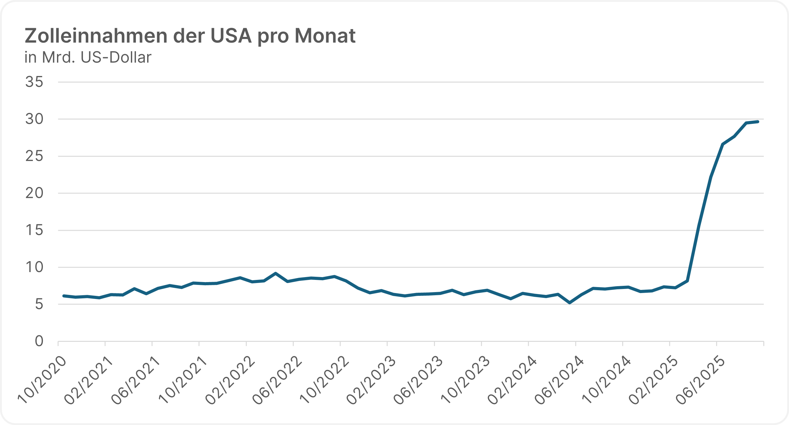 Das für Donald Trump laut seinen eigenen Aussagen schönste Wort im Wörterbuch ist „tariff“. Zölle werden derzeit als universelle Verhandlungsmasse in vielerlei Hinsicht erachtet. Ein Aspekt der aktuellen Zollpolitik ist der Schutz als kritisch eingestufter Bereiche und Sektoren in der US-Wirtschaft sowie die Sicherstellung der notwenigen Ressourcen und Rohstoffe. Andererseits kommen auch die Einnahmen zur Finanzierung der zentralen Wahlversprechen des letzten Wahlkampfs gelegen. Zu diesen Versprechen zählen unter anderem die Verlängerung der Steuersenkung aus dem Tax Cuts and Jobs Act, Steuererleichterungen bei Überstunden und Trinkgeldern und die Erhöhung der Ausgaben für Verteidigung und Grenzsicherung. Im vergangenen Fiskaljahr, also von Oktober 2024 bis September 2025,wurden Zölle in der Höhe von etwa 195 Mrd. USD eingehoben.