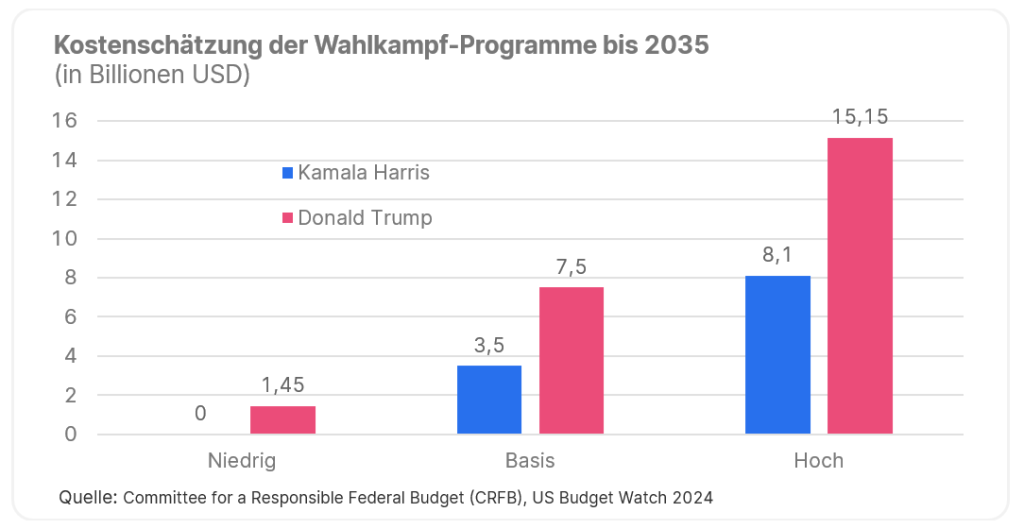 Die Bandbreite der Kostenschätzungen ist groß und wird im Falle von Kamala Harris vor allem von der Höhe der Sozialausgaben bestimmt. Die Größenordnung von Donald Trumps Plan wird vor allem vom Ausmaß an Steuerbegünstigungen (Unternehmen und Privatpersonen) und Militär- sowie Grenzsicherungsmaßnahmen beeinflusst. Die Pläne der beiden Kandidaten würden je nach tatsächlicher Umsetzung zu einer zusätzlichen Erhöhung der Verschuldung der USA bis zum Jahr 2035 beitragen.