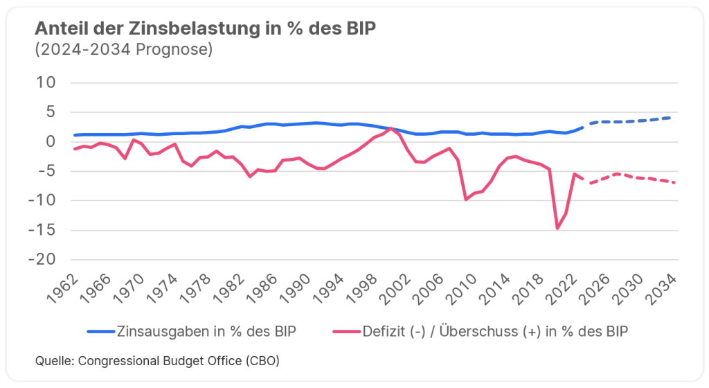 Die hohen Budget-Defizite der letzten Jahre sowie die gestiegenen Renditeniveaus an den Finanzmärkten haben die Zinsbelastung des US-Haushaltbudgets markant auf ein Niveau von etwa 3% bzw. 886 Mrd. USD im letzten Jahr ansteigen lassen, wodurch sie seit langem erstmals wieder geringfügig über dem Niveau der Militärausgaben lag.