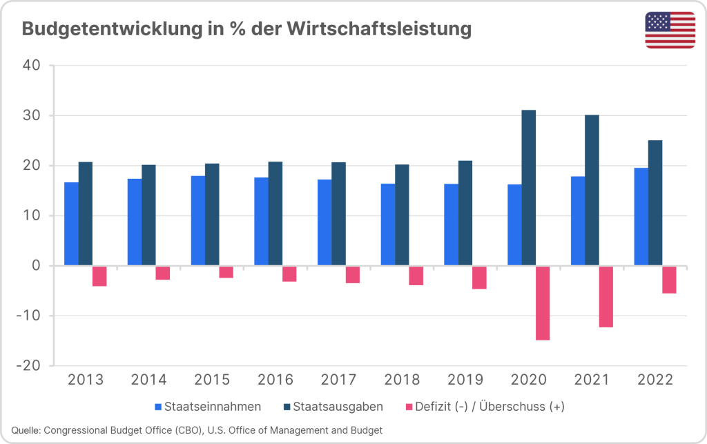 Doch diese waren nicht der alleinige Grund für die Schieflage. Bereits davor, nach der Wahl Donald Trumps zum Präsidenten wurden 2017 u.a. nicht gegenfinanzierte, großzügige Steuererleichterungen für Unternehmen beschlossen. In den vergangenen Jahren kamen noch Ausgaben im Sozialbereich sowie der Umweltpolitik unter dem aktuellen Präsidenten Joe Biden dazu.