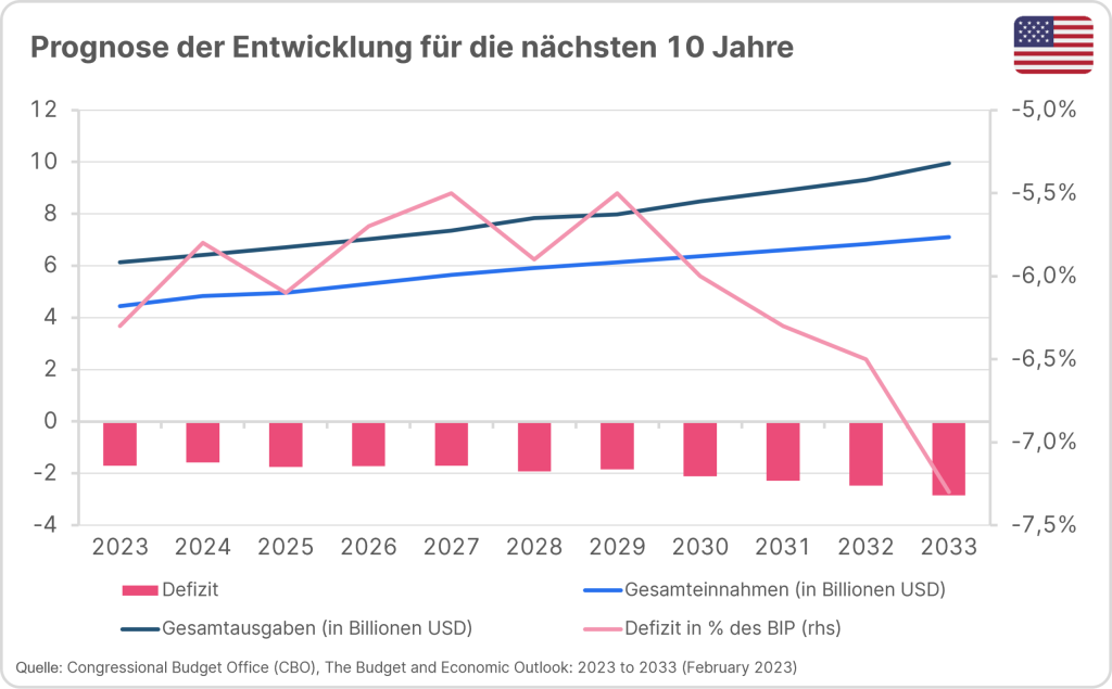 Die 10-Jahres Prognose des Congressional Budget Office (CBO) vom Februar 2023 erwartet, dass sich unter den aktuellen Umständen das Budgetdefizit in den kommenden Jahren mit -5,5% der Wirtschaftsleistung – leicht verringern könnte, jedoch in der zweiten Hälfte der Periode wieder deutlich ausweiten würde.