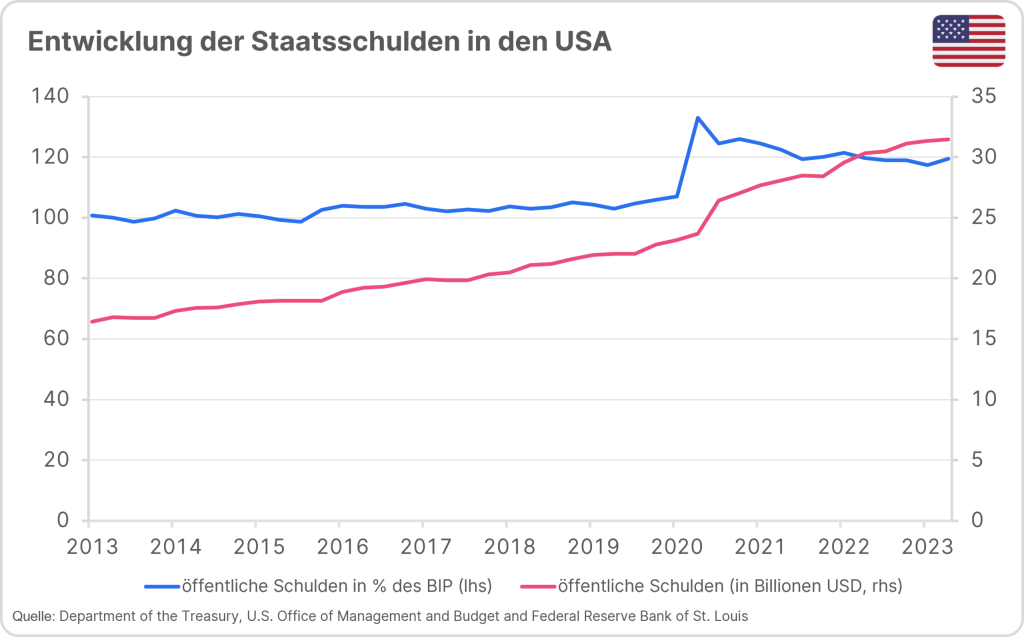Im Rückblick der letzten 10 Jahre haben sich die öffentlichen Schulden der USA in absoluten Zahlen auf etwa 33,7 Billionen US-Dollar annähernd verdoppelt. Vor allem die Ausgaben im Zuge der Bewältigung der Pandemie haben zu einem deutlichen Anstieg geführt. Die Staatsverschuldung gemessen an der Wirtschaftsleistung stieg damit auf knapp 120%.