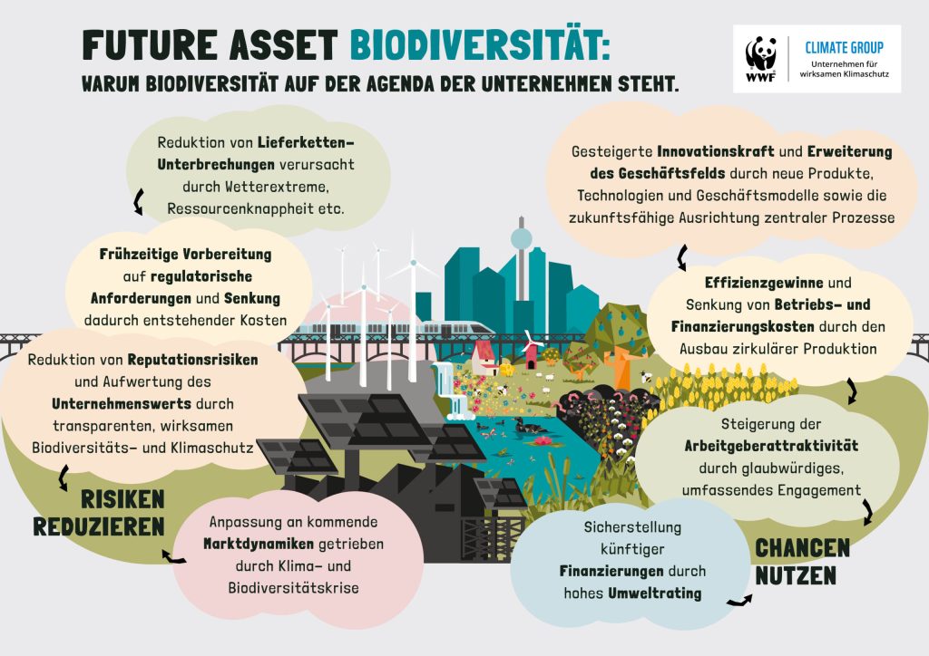 Der Global Risks Report 2023 des Weltwirtschaftsforums bestätigt, dass sechs der zehn größten Risiken für die Weltwirtschaft der nächsten zehn Jahre in direkten Zusammenhang mit der Umwelt stehen. Der Verlust der biologischen Vielfalt und der Zusammenbruch von Ökosystemen befinden sich neben Naturkatastrophen und einem Versäumnis, die Klimakrise einzudämmen, unter den ersten fünf Risiken. Dabei spitzen Landnutzungsveränderung, Übernutzung von Ressourcen, Klimakrise, Umweltverschmutzung und invasive Arten die Biodiversitätskrise immer weiter zu. Alle diese direkten Treiber sind auf wirtschaftliche Aktivitäten zurückzuführen. Gleichzeitig setzt der akute Verlust der Biodiversität Wirtschaftstreibende immer häufiger entlang ihrer gesamten Wertschöpfungsketten unter Druck.