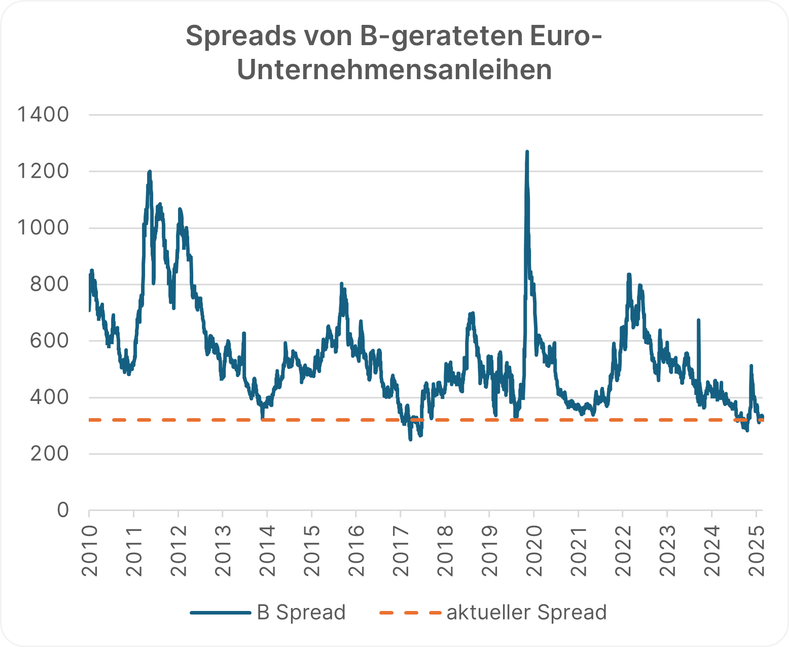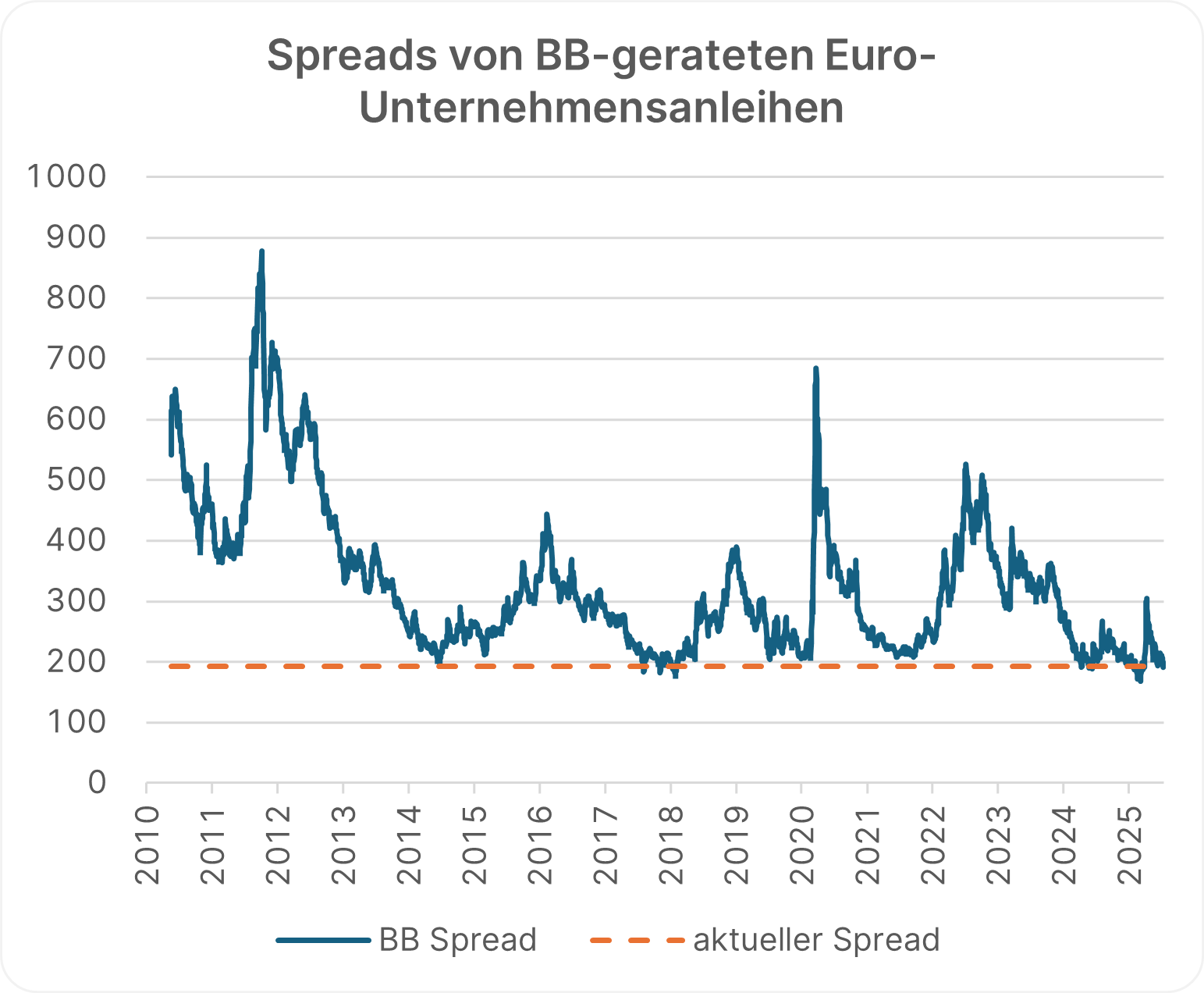 Im Juni 2025 liegen die Credit Spreads für Euro-Hochzinsanleihen auf historisch niedrigen Niveaus: BB-geratete Anleihen handeln mit etwa 200 Basispunkten über Staatsanleihen, B-geratete mit etwa 330 Basispunkten. Diese Werte sind im Vergleich zu langfristigen Durchschnittswerten niedrig, bieten aber weiterhin eine positive Risikoprämie. Im Vergleich zu historischen Ausfall- und Rückgewinnungsraten erscheinen die aktuellen Spreads ausreichend, um erwartete Kreditausfälle zu kompensieren – auch wenn die zusätzliche Risikoprämie geringer ist als in der Vergangenheit.