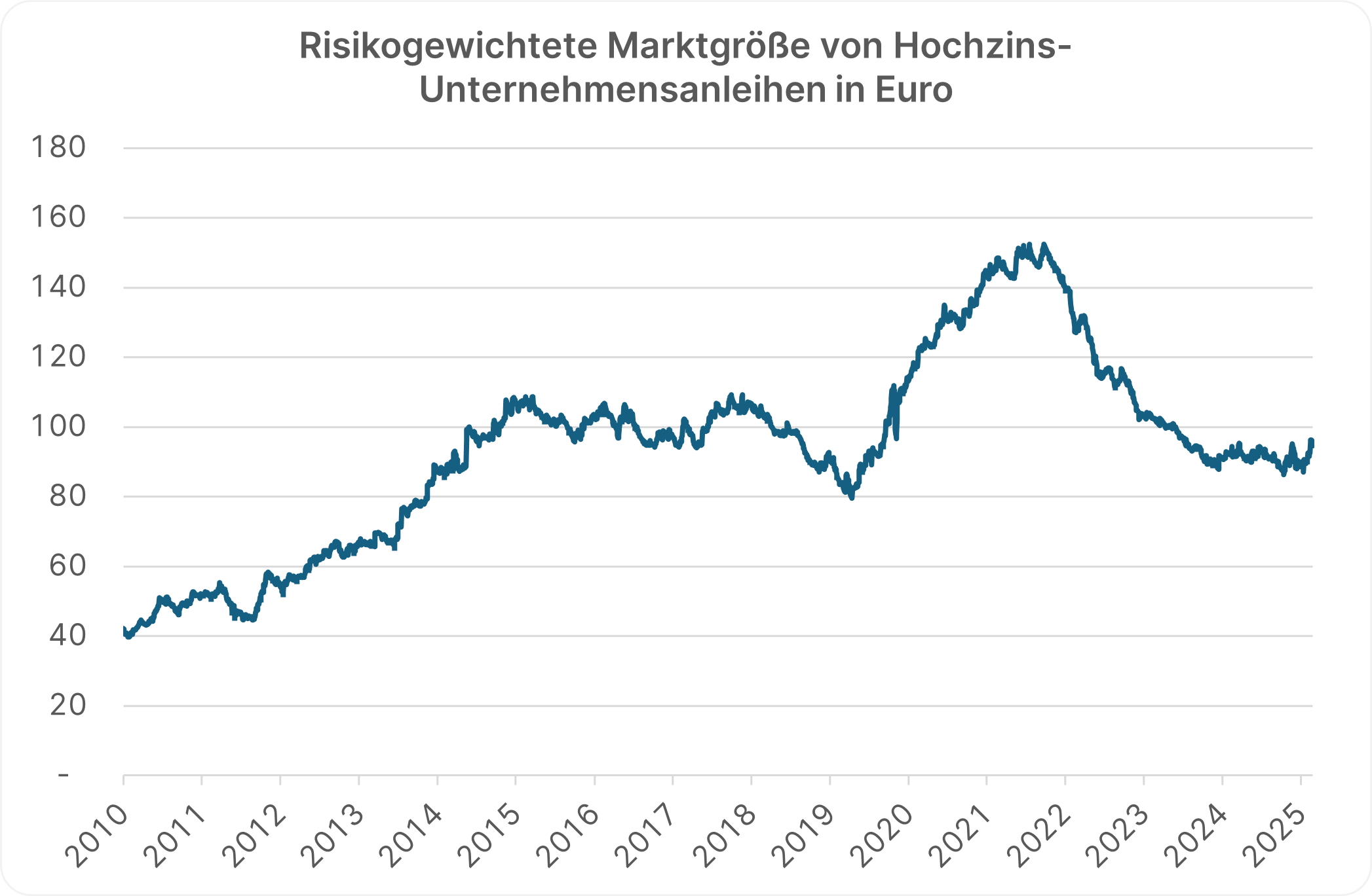 Ein Grund für die weiterhin engen Spreads ist die anhaltend hohe Nachfrage nach renditestarken Schuldtiteln, obwohl die risikoadjustierte Größe des Marktes – gemessen am DV01, einem Maß für die Zins- und Spreadsensitivität des Marktes – seit über einem Jahrzehnt nicht wesentlich gewachsen ist.