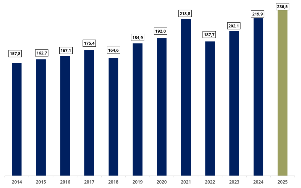 Entwicklung Fondsvolumen 2014/2025 – in Mrd. €