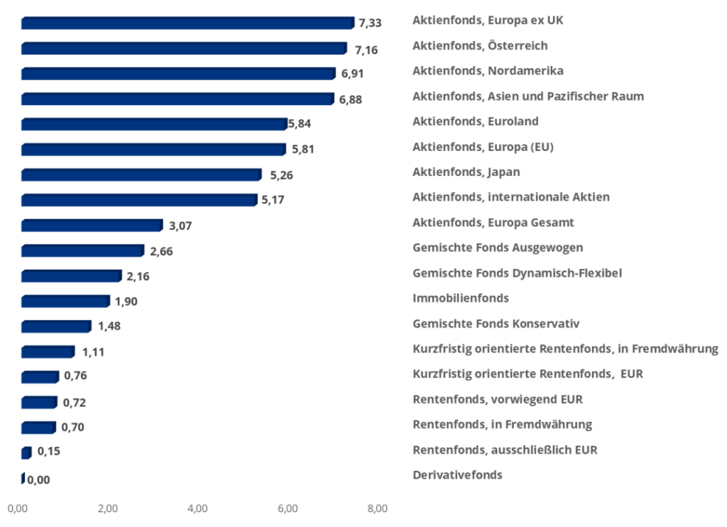 Performancesieger im 1-Jahreszeitraum waren österreichische Aktienfonds mit einem Plus von 40,4 %, dicht gefolgt von Aktienfonds, die in Unternehmen am europäischen Festland investieren. Mit einer Durchschnittsrendite von knapp über 7 % führen diese beiden Fondstypen auch das 10-Jahres-Ranking an.