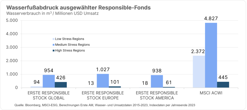 Hinweis: Der genannte Index wurde lediglich zum Vergleich herangezogen. Darstellung eines Index, kein direktes Investment möglich. Bitte beachten Sie, dass eine Veranlagung in Wertpapiere neben Chancen auch Risiken beinhaltet. Der Vergleichsindex hat keinen Einfluss auf den Ermessensspielraum der Verwaltungsgesellschaft bei der Auswahl der Vermögenswerte des ERSTE RESPONSIBLE STOCK GLOBAL, ERSTE RESPONSIBLE STOCK EUROPE und ERSTE RESPONSIBLE STOCK AMERICA. Bei der Ermittlung der durchschnittlichen Wasserintensität der in den Fonds gehaltenen Unternehmen wird als zentrale Kennzahl die von den Unternehmen veröffentlichte Wasserentnahme herangezogen. Die Wasserintensität misst den Wasserverbrauch in Kubikmeter pro einer Million US-Dollar Umsatzerlöse.
