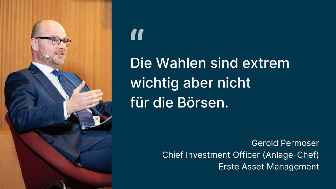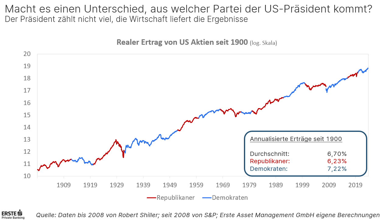 Für den Anlagechef der Erste Asset Management, Gerold Permoser, sind die Wahlen „extrem wichtig“, aber nicht für die Finanzmärkte“. Am Beispiel eines langlaufenden Charts seit 1900 führte er dem Publikum vor Augen, dass der US-Aktienmarkt sowohl unter einem demokratischen als auch unter einem republikanischen Präsidenten langfristig immer gestiegen sei.
