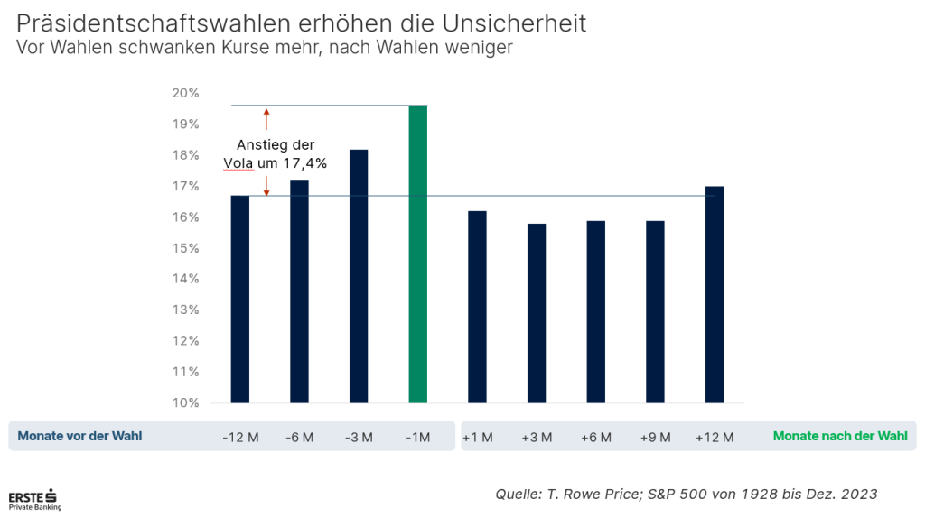 Die Volatilität, ein Maß für die Schwankung der Kurse, sei zu Wahlen hin zwar angestiegen, aber schon kurz nach der Wahl wieder gefallen. Die zentrale Frage ist für Permoser, wie es mit dem Wachstum nach den Wahlen weiter gehe. Fondsmanager positionieren sich selten direkt auf den Ausgang von Wahlen. Dafür seien Wahlen zu informationseffizient. Man finde keine Informationen, mit denen sich Wahlen besser prognostizieren lassen, als mit jenen die öffentlich verfügbar sind. Dazu kommt, dass Wahlversprechen der Politiker nicht 1:1 umgesetzt werden, bzw. es oft zu unbeabsichtigten Konsequenzen oder sogar dem Gegenteil vom beabsichtigten Ergebnis kommt: Beispielsweise als unter Trump die alternativen Energien boomten, während unter Biden Öl- und Gasunternehmen Auftrieb verspürten.