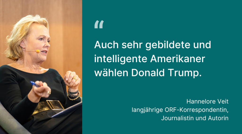 Hannelore Veit, die bereits die erste Amtszeit von Donald Trump als Leiterin des Washingtoner ORF-Büros begleitete, ging dem Phänomen Trump auf den Grund. Während der Vorwahlen bereiste sie die USA und erfasste Stimmungsbilder: von den akademischen Eliten bis zu den Arbeitern und Farmern in ländlichen Gemeinden, treffend zusammengefasst in ihrem aktuellen Buch „Wer hat Angst vor Donald Trump?“. Exemplare dieses Buches überreichte sie den Teilnehmer:innen der Veranstaltung mit persönlicher Widmung.