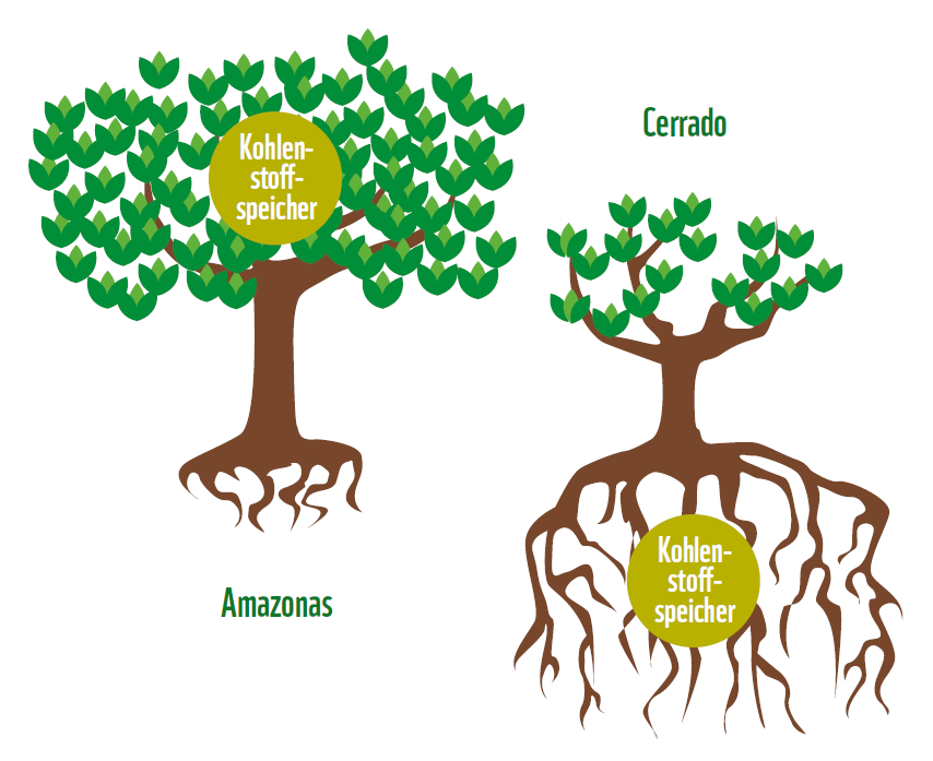 Anders als im benachbarten Amazonas, wird der Cerrado auch der „auf dem Kopf stehende Wald“ genannt. Die Biomasse befindet sich zu 2/3 unter der Erde, im Vergleich zum Amazonas, wo 2/3 der Biomasse überirdisch und im üppigen grün sichtbar sind. Der Kohlenstoff ist daher überwiegend im Boden gespeichert, die Wurzelsysteme gehen bis zu 30 Meter tief in den Boden.