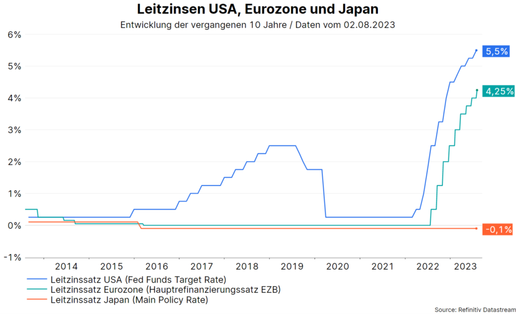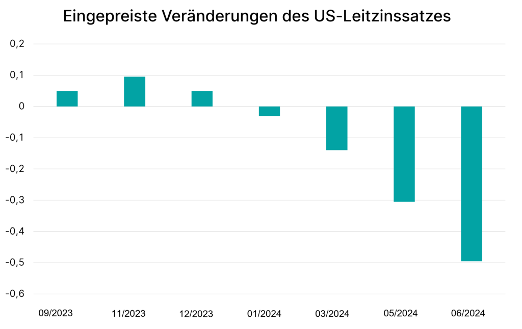 Aus heutiger Sicht halten wir es für wahrscheinlicher, dass die EZB die Zinssätze noch einmal anheben muss, während die Fed ihren Zinserhöhungszyklus wahrscheinlich abgeschlossen hat. Auch die Märkte preisen aktuell keine weiteren Leitzinsanhebungen in den USA ein: