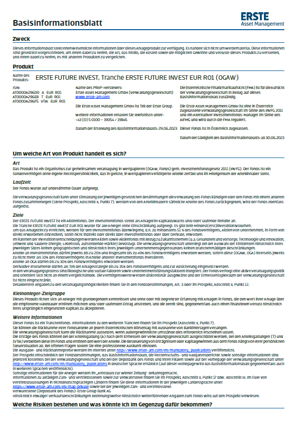 Der Prospekt für OGAW-Fonds (sowie dessen allfällige Änderungen) wird entsprechend den Bestimmungen des InvFG 2011 idgF erstellt und veröffentlicht. Für die von der Erste Asset Management GmbH verwalteten Alternative Investment Fonds (AIF) werden entsprechend den Bestimmungen des AIFMG iVm InvFG 2011 „Informationen für Anleger gemäß § 21 AIFMG“ erstellt.