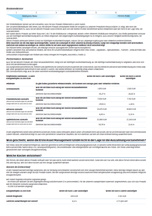 Hinweis: Sie sind im Begriff, ein Produkt zu erwerben, das schwer zu verstehen sein kann. Bevor Sie eine Anlageentscheidung treffen, empfehlen wir Ihnen, die erwähnten Fondsdokumente zu lesen. Diese Unterlagen erhalten Sie zusätzlich zu den oben angeführten Stellen kostenlos am jeweiligen Sitz der vermittelnden Sparkasse und der Erste Bank der oesterreichischen Sparkassen AG. Sie können die Unterlagen auch elektronisch abrufen unter www.erste-am.com.
