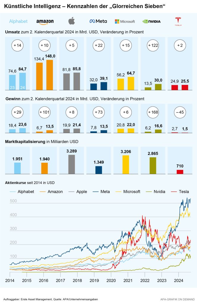 Profitiert haben bisher vor allem die Anbieter der für die KI nötigen Infrastruktur und hier vor allem die Anbieter von Cloud-Services. So hat Oracle dank seiner starken Cloud-Sparte mit seinen Quartalszahlen zuletzt positiv überrascht. Der Konzernerlös stieg zum Auftakt des Geschäftsjahres 2024/2025 um 8 Prozent auf 13,3 Mrd. Dollar. Davon entfielen 5,6 Mrd. Dollar auf das Cloud-Geschäft, das um 22 Prozent zulegte.