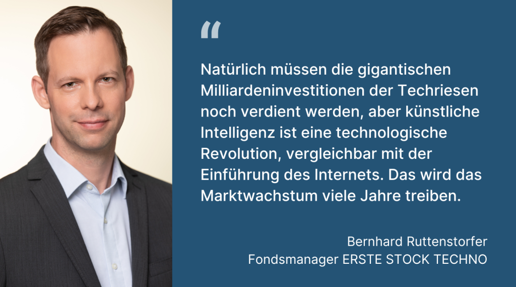 Von dem anhaltenden KI-Boom profitieren die im Technologie-Aktienfonds ERSTE STOCK TECHNO gehaltenen Titel. Die europäische Fondsplattform CAPinside führt den Fonds aktuell unter den zehn am besten verwalteten Technologie-Aktienfonds weltweit. Fondsmanager Bernhard Ruttenstorfer setzt vor allem auf Halbleiter-Aktien, die aktuell mit 29 % prominent gewichtet sind. Korrekturen, wie sie im August erfolgt sind, sieht er als Korrektur im Aufwärtstrend und eine Möglichkeit für Zukäufe zu einem günstigeren Preisniveau. „Die Nachfrage in der Halbleiterindustrie wird breiter und die Software-Industrie stabilisiert sich. Natürlich müssen die gigantischen Milliardeninvestitionen der Techriesen noch verdient werden, aber künstliche Intelligenz ist eine technologische Revolution, vergleichbar mit der Einführung des Internets. Das wird das Marktwachstum viele Jahre treiben.“