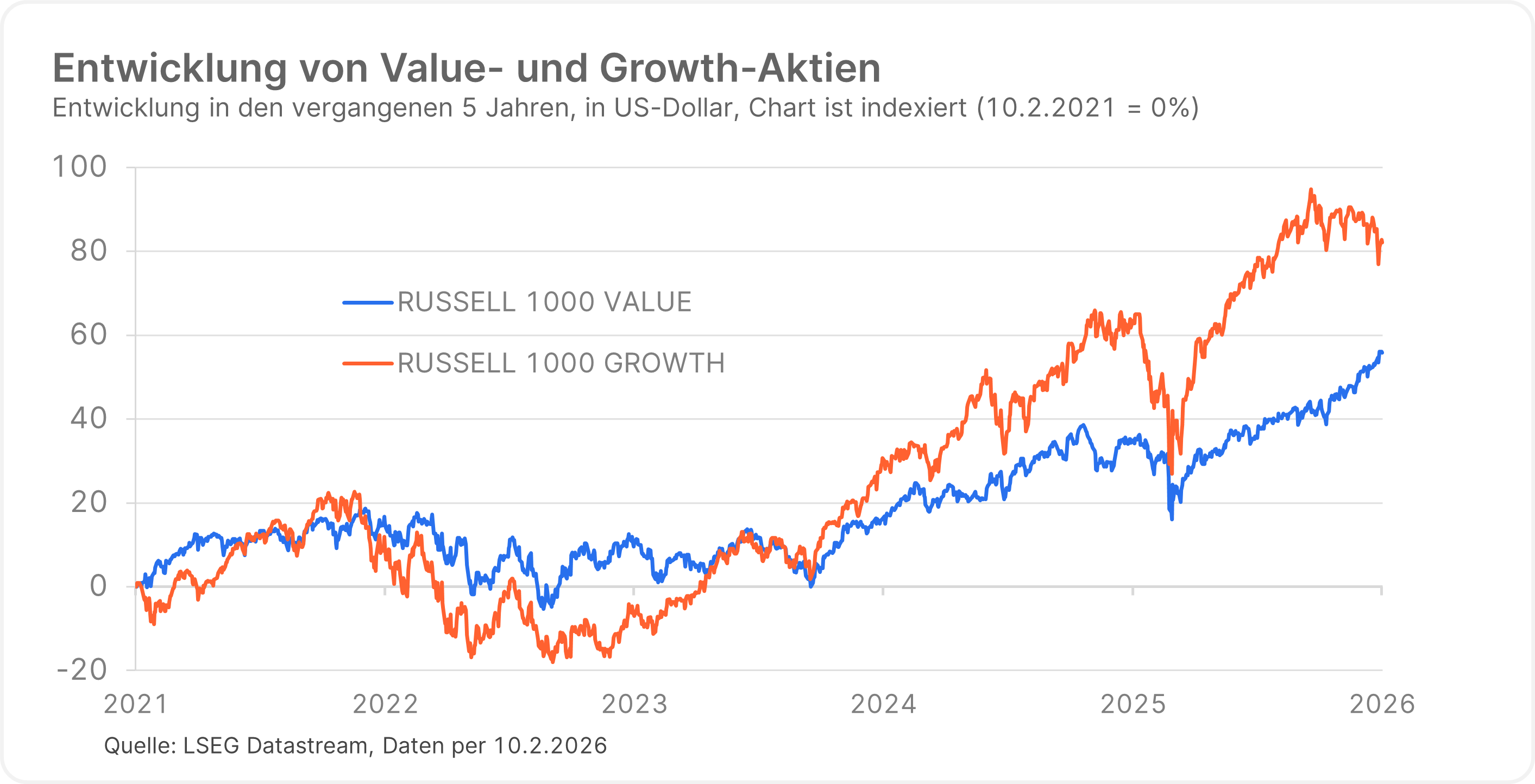 Damit sind wir beim zentralen Punkt. Seit Oktober 2025 läuft eine ausgeprägte Rotation von Wachstums‑ zu Substanzwerten, die sich zuletzt deutlich verstärkt hat. So legte der Russell 1000 Value Index um rund 10,7 % zu, während der Russell 1000 Growth Index um 2,0 % nachgab.