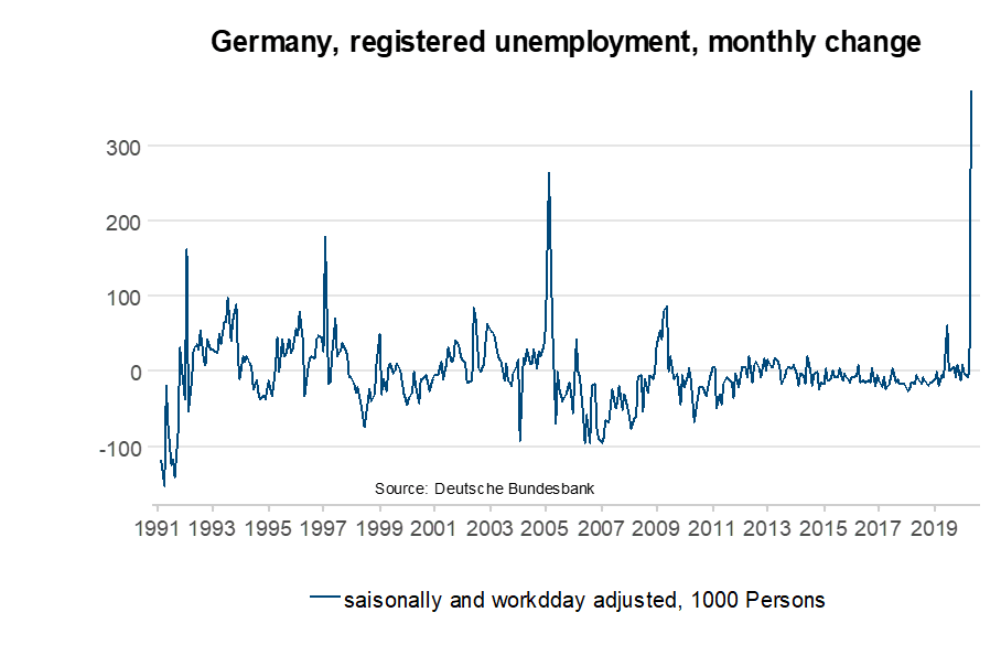 Zahlreiche Indikatoren deuten auf einen deutlichen Rückgang der Beschäftigung beziehungsweise auf einen deutlichen Anstieg der Arbeitslosenrate in vielen Ländern hin. Das kann unter anderem an den Anträgen auf Arbeitslosenunterstützung abgelesen werden. Der Internationale Währungsfonds (IMF) veranschlagt für die entwickelten Volkswirtschaften einen Anstieg der Arbeitslosenrate von 4,8 Prozent der Erwerbsbevölkerung im Jahr 2019 auf 8,2 Prozent in diesem Jahr. Für nächstes Jahr wird ein Rückgang auf 7,2 Prozent erwartet. Das bedeutet einen Anstieg der Arbeitslosigkeit für heuer um 70 Prozent. Selbst im nächsten Jahr wird die Arbeitslosigkeit immer noch mit 30 Prozent über dem Ausgangsniveau liegen. Die Weltbank schätzt die gesamte Erwerbsbevölkerung der „reichen“ (High- Income) Länder auf 616 Millionen Personen. Daraus ergibt sich eine Arbeitslosenzahl von rund 30 Millionen im vergangenen Jahr. Dieses könnte heuer um 20 Millionen auf 50 Millionen anwachsen.