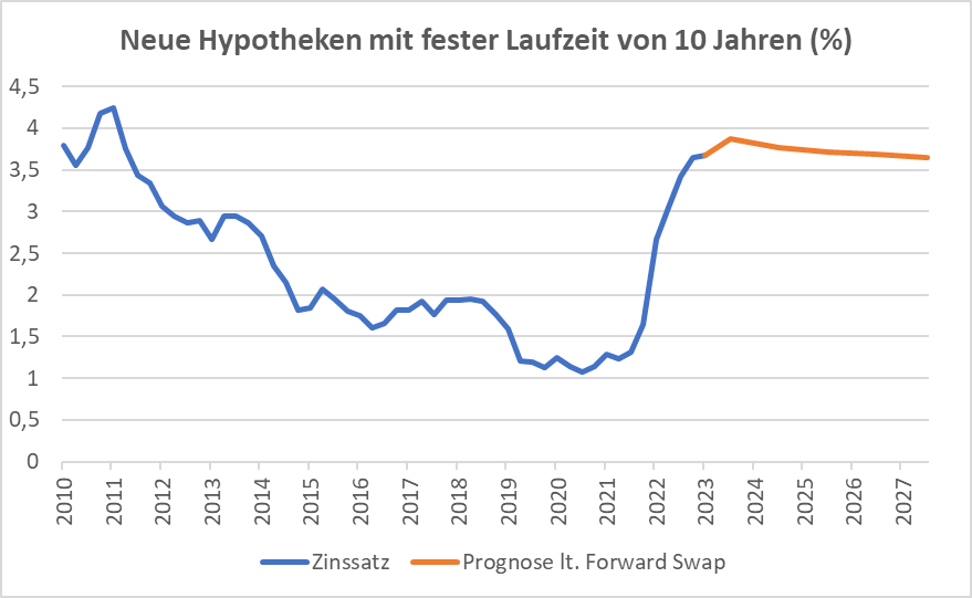Etwa die Hälfte der deutschen Haushalte besitzt ein Eigenheim. Hypothekendarlehen haben in der Regel eine Zinsbindung von etwa 10-15 Jahren. Zinserhöhungen werden sich daher erst mit Verzögerung auf die bestehenden Kreditnehmer:innen auswirken, während ihr laufendes Einkommen im Durchschnitt steigt.