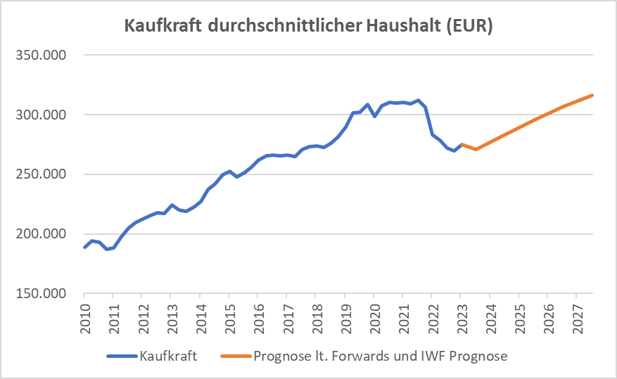 Zwischen 2010 und 2019 führten steigende Haushaltseinkommen und sinkende Zinssätze zu einer höheren Haushaltskaufkraft. Seit 2022 haben die höheren Zinssätze jedoch die Kaufkraft geschwächt, was nur teilweise durch höhere Nominaleinkommen kompensiert wurde. Wenn sich die Hypothekenzinsen stabilisieren, wie der Swap-Markt derzeit preist, und das nominale Einkommen entsprechend den Prognosen des IMF weiter wächst, dürfte sich die Kaufkraft der Haushalte in naher Zukunft erholen.