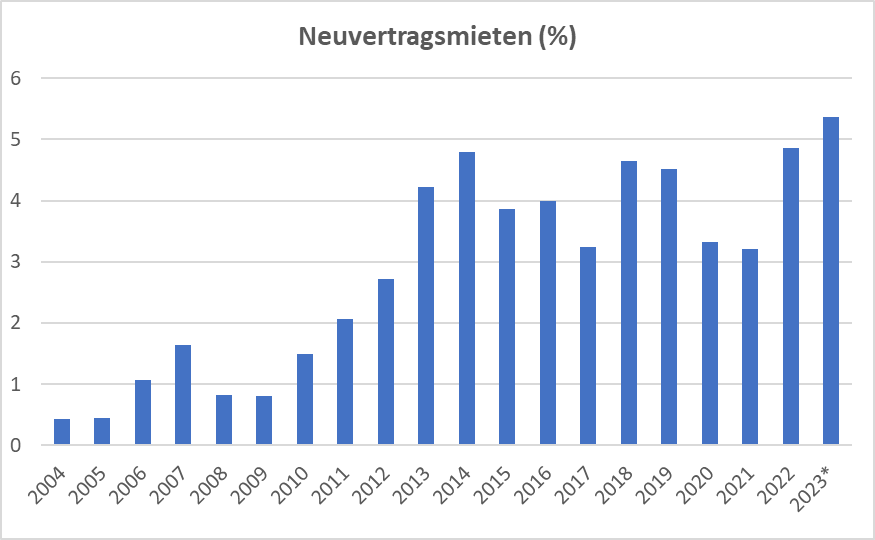 Das Angebot an Mietwohnungen war in vielen Großstädten bereits knapp, was die Mieten in die Höhe trieb. Mit dem jüngsten Anstieg der Inflation und der Zinssätze hat sich dieser Trend beschleunigt, wobei die Neuvertragsmieten (ohne Energiekosten) im zweiten Quartal 2023 um 5,4 % über dem Durchschnitt des Jahres 2022 lagen. Im Durchschnitt lagen die Neuvertragsmieten in Q2 2023 um 16% höher als in Q4 2019.