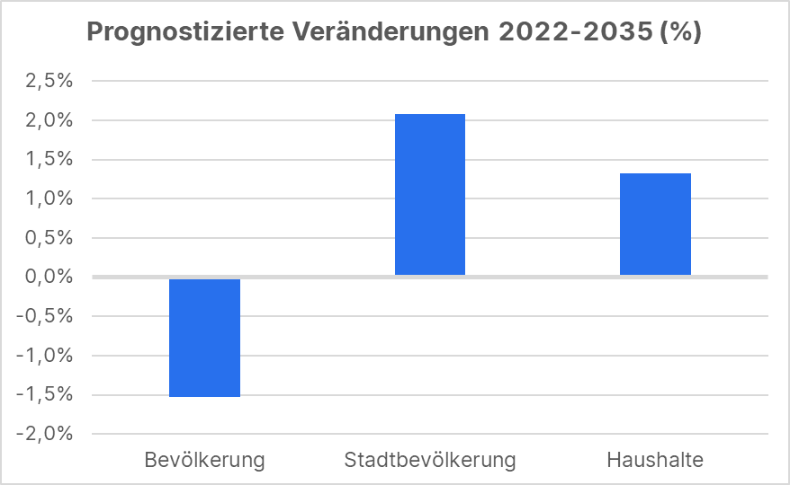Das Statistische Bundesamt in Deutschland prognostiziert einen Rückgang der durchschnittlichen Haushaltsgröße von 1,98 Personen pro Haushalt im Jahr 2022 auf 1,94 im Jahr 2035, was zu einem Anstieg der Zahl der Haushalte um 1,3 % führen würde. Insgesamt wird nach diesen Prognosen der Bevölkerungsrückgang durch kleinere Haushaltsgrößen und eine zunehmende Verstädterung überkompensiert, so dass die Zahl der städtischen Haushalte und die Nachfrage nach städtischem Wohnraum weiter steigen dürfte.