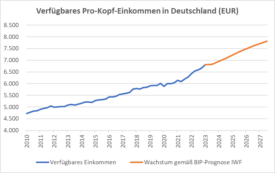 Haushalte, die ihre Wohnung mieten, zahlen die Miete in der Regel mit ihrem laufenden Einkommen. Wenn ihr verfügbares Einkommen steigt, können sich die Haushalte auch höhere Mieten leisten. Während das verfügbare Pro-Kopf-Einkommen zwischen Q4 2021 und Q2 2023 um 10% gestiegen ist, gehen die BIP-Prognosen des IWF (Internationaler Währungsfonds) von einem Wachstum des verfügbaren Einkommens von etwa 3,5 % pro Jahr in den nächsten 5 Jahren aus.