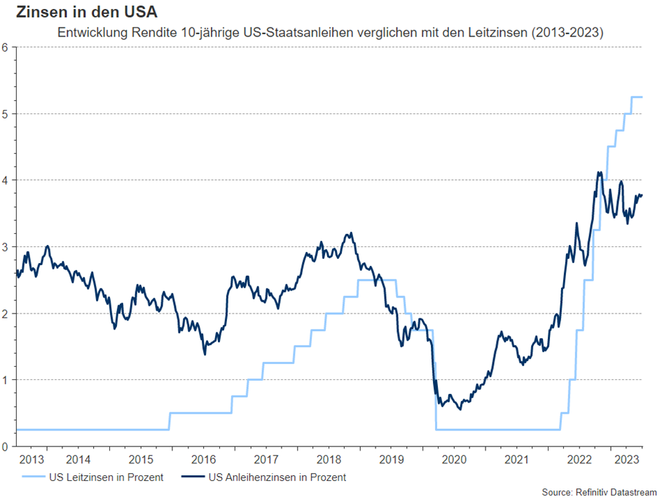 Zudem haben die Erwartungen für Leitzinssenkungen nach dem Erreichen des Zinshöhepunktes abgenommen. Der Zeitpunkt wurde weiter in die Zukunft verschoben, das Ausmaß hat abgenommen. Das hat zwei Gründe. Erstens implizieren die Hinweise für ein anhaltendes Wirtschaftswachstum (mit Abwärtsrisiken) eine eher niedrige Wahrscheinlichkeit für eine unmittelbare „echte“ Rezession in den entwickelten Volkswirtschaften. Im Unterschied zu einer Stagnation beziehungsweise „technischen“ Rezession, wird sie als Rückgang des realen Wirtschaftswachstums zwei Quartale in Folge definiert. Wenn eine Rezession ausbleibt, werden die Zentralbanken die Leitzinsen weniger senken. Zudem könnte die Inflation zwar weiter fallen, aber sich über dem Zentralbankziel von 2% verankern. Damit verbunden wäre ein höheres Leitzinsniveau auf lange Sicht. Außer die Zentralbanken geben das Inflationsziel auf, entweder explizit oder versteckt. Zumindest ließe sich so erklären, warum der Renditeanstieg von US-Staatsanleihen seit Anfang Juli (von 4,37% auf 4,55%, Quelle Bloomberg) mit dem Anstieg der inflationsadjustierten Rendite (von 2,09% auf 2,27%) einhergegangen ist.