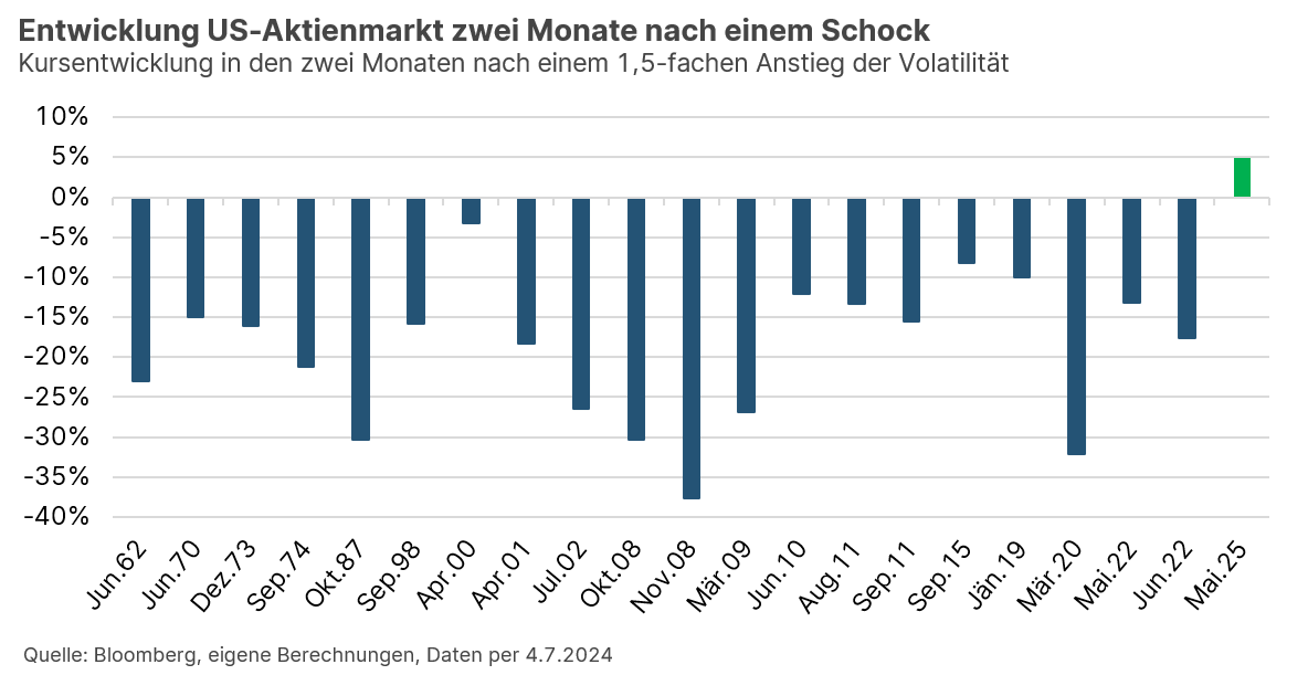 „Viel Lärm um nichts“ könnte man meinen, wenn man sich die Kursentwicklungen auf Jahressicht ansieht. Globale Aktien notieren basierend auf dem MSCI World in Euro mit einem leichten Minus und zahlreiche Aktienmarktindizes erreichten zuletzt sogar neue Allzeithöchststände. Diese Betrachtungsweise ignoriert jedoch den zwischenzeitlichen Aktienmarkteinbruch im April und die im Anschluss erfolgte Kurserholung im Mai. Vor allem die Geschwindigkeit der Erholung war enorm, wie die unten dargestellte Grafik veranschaulicht. Diese zeigt die Kursentwicklungen des amerikanischen Aktienmarktes zwei Monate nach einem Kurseinbruch, welcher mit einem Anstieg der Volatilität um das 1,5-fache einherging. Seit dem zweiten Weltkrieg hat es keine vergleichbare Gegenbewegung gegeben, bei der Verluste in so kurzer Zeit wieder vollständig ausgeglichen und letztlich sogar übertroffen wurden.