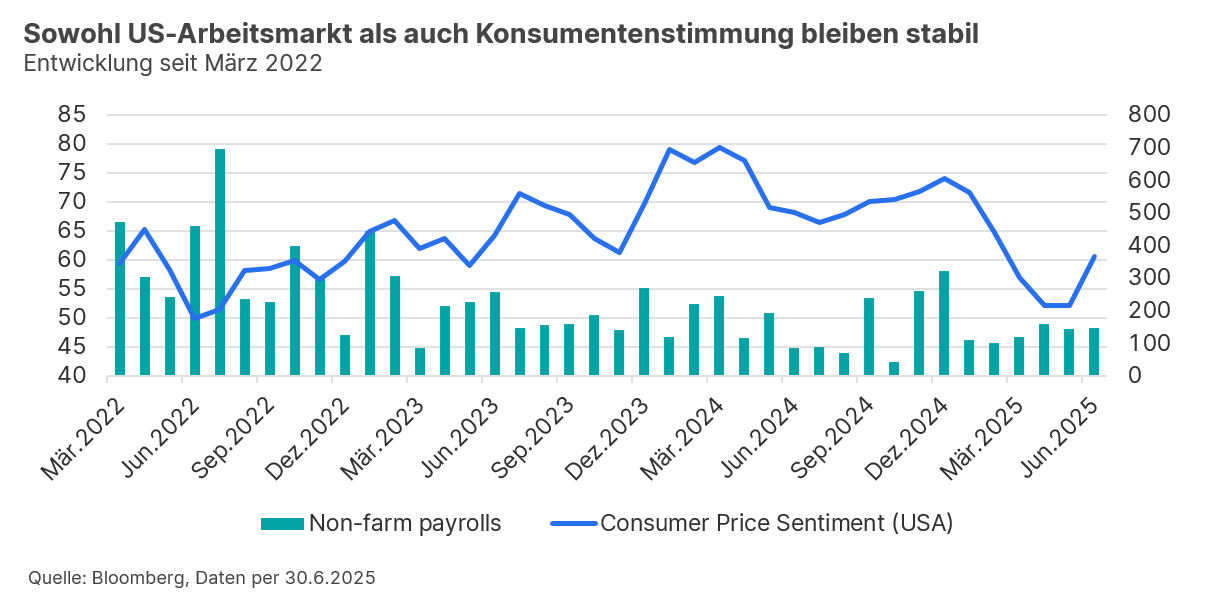 Auch die aktuellen volkswirtschaftlichen Zahlen zeigen weiterhin ein gesamthaft robustes Bild. Der viel beachtete US-Arbeitsmarkt kühlt sich zwar ab, aber die Nachfrage nach Arbeitskräften bleibt stabil. Wie unten dargestellt, wurden im Juni beispielsweise 147.000 Stellen neu geschaffen und somit die Erwartungshaltung der Ökonom:innen (110.000 Stellen) deutlich übertroffen. Neben dem Arbeitsmarkt zeigt auch der für die US-Wirtschaft so wichtige Konsum vorerst keine Schwäche – die unten angeführte Stimmung der US-Konsument:innen hat sich nach dem Tief im April erstaunlich schnell erholt und erweckt den Anschein, als hätten wir das Gröbste hinter uns.